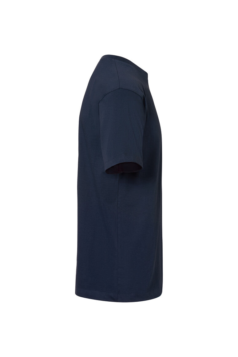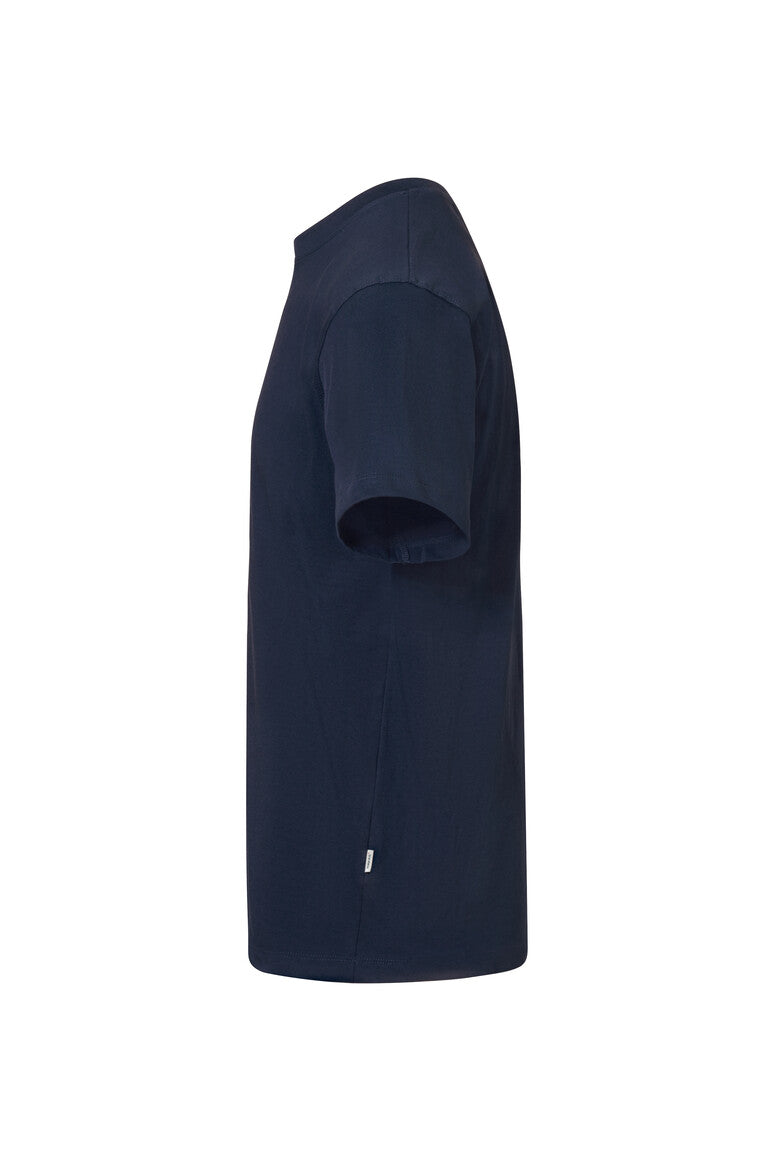 Klassisches T-Shirt mit rundem Halsausschnitt, LYCRA®-verstärktem Halsbündchen und Nackenband. Hergestellt aus schwerem Single-Jersey aus langstapeliger, gekämmter und ringgesponnener CmiA-Baumwolle. Gewebtes HAKRO Necklabel aus hochwertigem Kettsatin mit weichen, ultraschallgeschnittenen Bandkanten für höchsten Tragekomfort und gewebtes HAKRO Flaglabel an der linken Seitennaht.